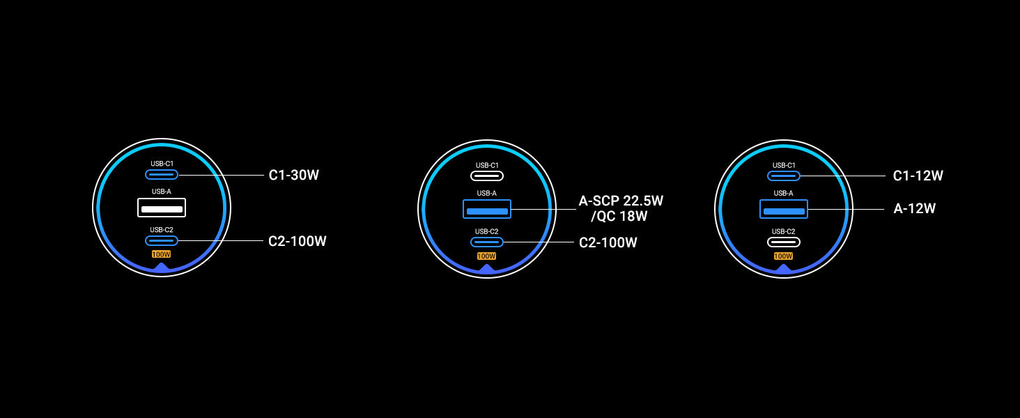 USB-C1+USB-C2: 30W+100W / USB-C1+USB-A: 5V/4.8A / USB-C2+USB-A: 100W+22.5W