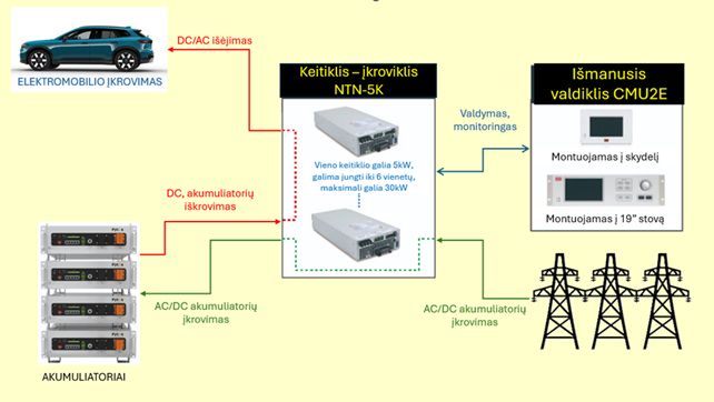 - Galima sujungti iki 6 AC išėjimo įrenginių lygiagrečiai, išplečiant galią iki 30 kW (5+1 vienetai).