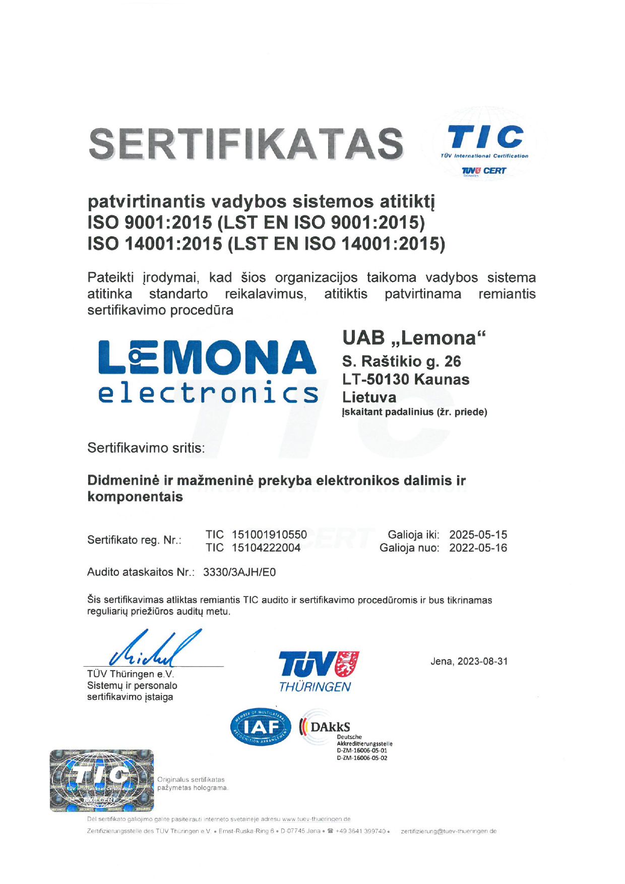 Oleme kaasaegne, innovatiivne ettevõte, mis püüab täita ISO nõudeid ning tagada oma toodete ja teenuste kvaliteedi, ohutuse ja usaldusväärsuse. Töötame järjepidevalt, täiustame protsesse, otsime parendusvaldkondi ja täiustame pidevalt. Seda kinnitavad LEMONA electronicsi saadud ISO sertifikaadid.
