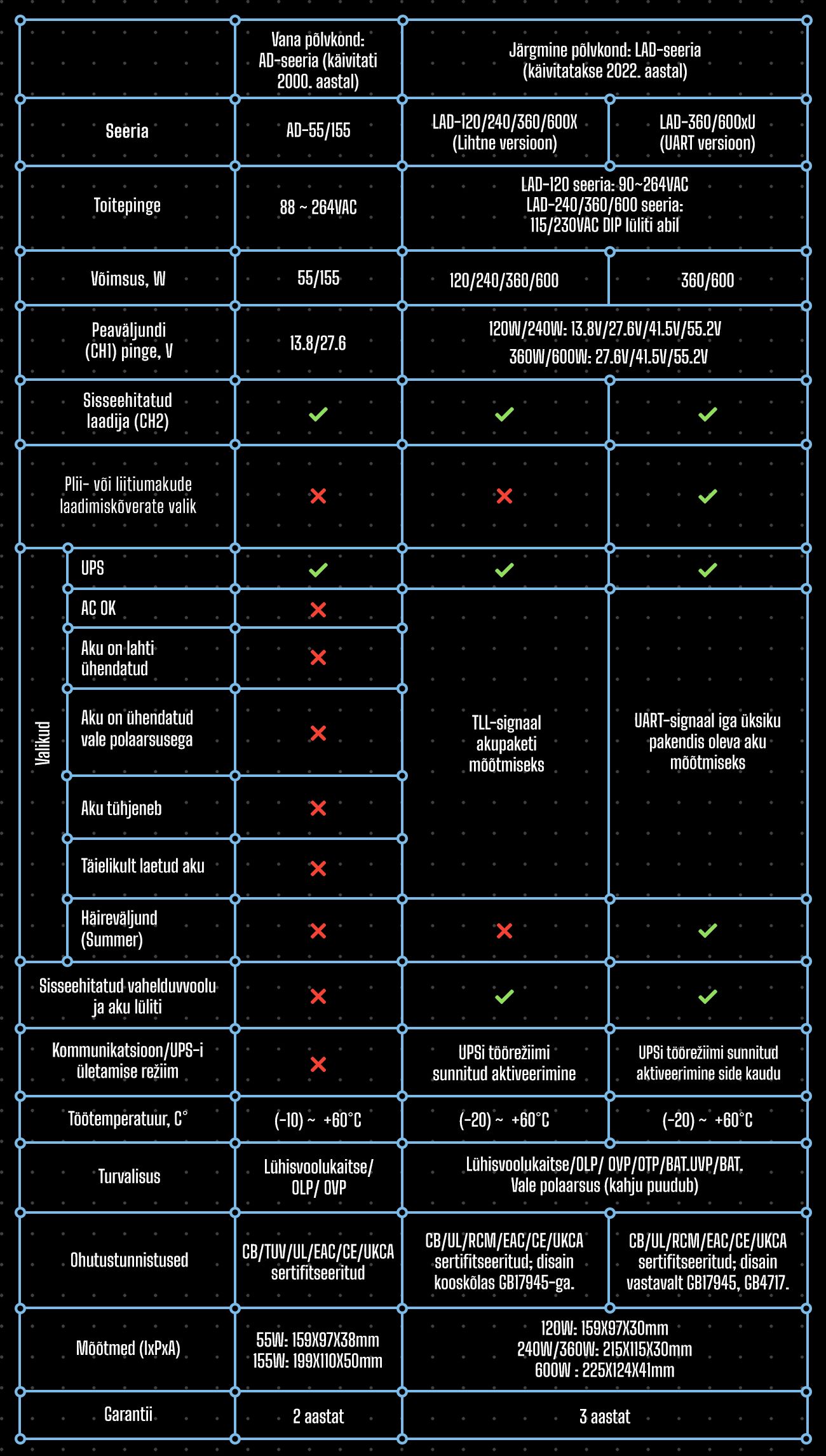 Vanema põlvkonna ja LAD-seeria parameetrite võrdlemiseks vaadake järgmist tabelit: